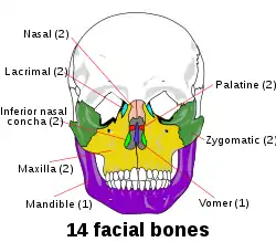 Більшість кісток лицевого черепа парні, за винятком лемеша і нижньощелепної кістки. Усього налічується 14 лицевих кісток.