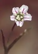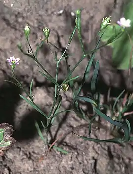 Листки лінійні, 1–2.5 мм завдовжки. Чашечки широко дзвонові, 2.5–3 мм завдовжки. Пелюстки вдвічі довші від чашечки[3]. Однорічна трав'яниста рослина 5–15 см заввишки. Стебло рясно розгалужене від основи, від голого до практично голого, блакитно-зелене. Листки супротивні, без черешка. Листові пластини лінійні, з цілим краєм, блакитно-зелені. Суцвіття нещільне багатоквіткове. Віночок радіально-симетричний, ніжний рожевий, ≈ 0.5–1 см шириною; пелюстків 5, цілі, темно-жильні. Чашечка 5-листочкова, біло-смугаста. Тичинок 10. Плід — вузько-яйцеподібна, яка розщеплюється на 4 частки, коробочка, довша від чашечки[4].