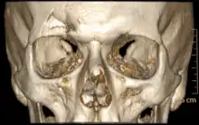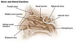 ![]() Права половина лицевого черепа. Лобова пазуха виділена зеленим. | |