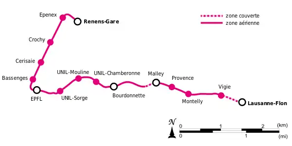 На лінії є п'ятнадцять станцій. У Лозанні кінцева станція метро поєднана з кінцевою станцією приміської вузькоколійної залізниці LEB (станція підземна, дворівнева. Метро і LEB використовують різні рівні). У Ренані кінцева станція метро поєднана зі станцією державних залізниць.