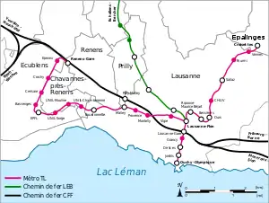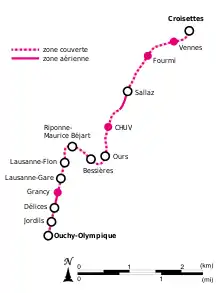 - Від станції Lausanne-Flon до станції Vigie (відразу за Vigie лінія виходить з тунелю)
