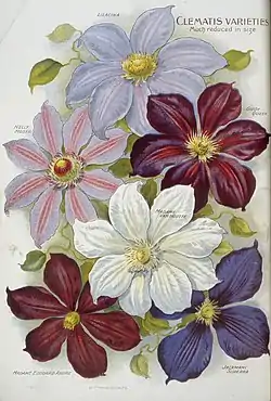Clematis addisonii • Clematis albicoma • Clematis alpina • Clematis apiifolia • Clematis armandii • Clematis baldwinii • Clematis bigelovii • Clematis brachiata • Clematis campaniflora • Clematis carrizoensis • Clematis catesbyana • Clematis cirrhosa • Clematis coactilis • Clematis columbiana • Clematis crispa • Clematis dioica • Clematis drummondii • Clematis flammula • Clematis flammulastrum • Clematis florida • Clematis fremontii • Clematis fusca • Clematis glaucophylla • Clematis guadeloupae • Clematis henryi • Clematis heracleifolia • Clematis hirsuta • Clematis hirsutissima • Clematis integrifolia • Clematis X jackmanii • Clematis koreana • Clematis lasiantha • Clematis ligusticifolia • Clematis macropetala • Clematis microphylla • Clematis montana • Clematis morefieldii • Clematis occidentalis • Clematis ochroleuca • Clematis orientalis • Clematis pauciflora • Clematis pitcheri • Clematis polygama • Clematis recta • Clematis reticulata • Clematis socialis • Clematis songarica • Clematis tangutica • Clematis terniflora • Clematis texensis • Clematis versicolor • Clematis viorna • Clematis virginiana • Clematis vitalba • Clematis viticaulis • Clematis viticella • Clematis welwitschii | |