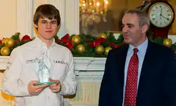 Гарі Каспаров вручає приз Магнусу Карлсену - переможцю турніру 2010 року