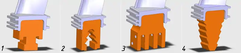 1. Т-подібний хвостовик; 2. Грибоподібний хвостовик (ластівчиний хвіст); 3. Вилкоподібний хвостовик; 4. Ялинкоподібний хвостовик