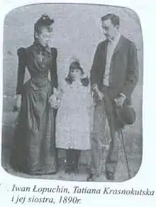 - Іван Миколайович (нар.1862-пом.1942, Флоренція). Володів майоратом в Хрустині, на той час Королівство Пруссія. На час Першої світової війни виїхав з сім'єю спочатку до Києва, а згодом і до маєтку сватів Дервізів в Старожилово. Після Жовтневого перевороту 1917 року емігрував до Франції, згодом в Італію, але навідувався у Польщу. Дружина — з 1890 р. Тетяна, (нар.1872-1885-пом.1938)(Була сестрою милосердя у Білій армії), донька генерал-ад'ютанта військового наказного отамана Донського козачого війська (1874–1881) Миколи Олександровича Краснокутського (нар.1818, — пом.18 березня 1891, Сан-Ремо), який від царя за придушення польсько-литовсько-українського національно-визвольного повстання 1963–1964 рр. проти Російської імперії отримав конфісковані у польських власників маєтки в Хрустині, Болеславці, Кам'янці, В'єв'юрці, Мелешині, Мелешинку, Криворіччі та Мокрську і віддав усе як придане доньці, та його дружини Анни Григорівни (нар.23 березня 1848, Одеса — пом.13 липня 1952, Вроцлав), у дівоцтві княжни Голіциної, мати якої — Єлизавета Іванівна у дівоцтві Жеванова (нар.24 жовтня 1818 — пом.27 січня 1860, Вісбаден) — народилася в Єлисаветграді. В Хрустині завершив розпочате тестем будівництво Хрустинського замку, який у 1922 році продав уряду Польщі.[3] У родині Теофіли Кемпи у дівоцтві Пілатовської зберігається родинне фото Лопухіних[4].