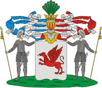 У щиті, що має срібне поле, зображений червоний грифон, обернений праворуч. Щит увінчаний звичайним дворянським шоломом з дворянською короною на ньому, на поверхні якої видно сім павичевих пір'їн. Намет на щиті блакитний і червоний, підбитий сріблом. Щит тримають два озброєні воїни, що тримають у руках по одному спису.