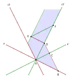 Перше зображення: Якщо задано стрижень, що перебуває в стані спокою у S', то його кінці розташовані на осі ct' і вісь паралельна до нього. У цій системі відліку одночасними (паралельне осі х') виступають положення кінців О і В, таким чином, власна довжина задається відрізком OB. Але в S одночасними (паралельними осі х) положеннями є О і А, таким чином, скорочена довжина задається відрізком ОА.