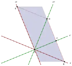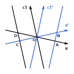 З іншого боку, якщо інший стрижень знаходиться в стані спокою в S, то його кінці розташовані на осі ct і вісь паралельна йому. У цій системі відліку одночасними (паралельними осі х) положеннями виступають кінці O і D, таким чином, власна довжина задається OD. Але в S' одночасними (паралельними осі х') є позиції O і С, таким чином, скорочена довжина задається OC.