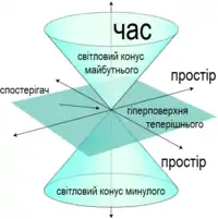 | Часопросторова інтерпретація | жодної | Ньютонівський простір-час | простір-час Мінковського |
