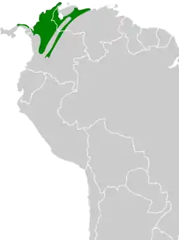 Вид поширений в Панамі, на півночі Колумбії та Венесуели. Його природним середовищем існування є субтропічні або тропічні вологі низинні ліси та субтропічні або тропічні вологі гірські ліси.