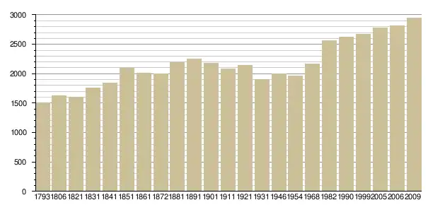 - Cassini : recensements avant 1968 ; recensements INSEE : depuis 1968 ; enquête INSEE : 2005., наведено за французькою вікіпедією