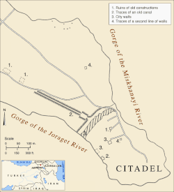 Місто, що оточувало цитадель, охоплювало територію близько 25 гектарів. Місто також було огороджено стінами, від яких збереглись лише залишки фундаментів.