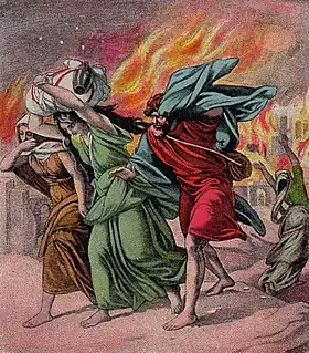 Коли Лот сидів у брамі содомській, до нього прийшли два ангели, які хотіли перевірити, чи дійсно в Содомі твориться те, що про нього говорять. Лот запрошував ангелів до себе в будинок, але вони сказали, що будуть спати на вулиці. Лот їх сильно просив і нарешті упросив. Він зробив їм частування і спік прісні хліби. Однак не встигли вони ще лягти спати, як жителі всього міста прийшли до його будинку з вимогою вивести до них гостей, щоб содомляни «пізнали їх». Лот вийшов до жителів міста з відмовою, запропонувавши натомість двох своїх незайманих дочок, щоб ті робили з ними, що їм заманеться. Жителям міста це не сподобалося і вони стали проявляти агресію відносно до самого Лота. Тоді ангели засліпили їх, а Лота і його рідним наказали покинути місто, оскільки воно буде зруйноване. Зятям, які мали взяти дочок Лота, здалося, що це жарт і з Содому ангели вивели лише Лота, його дружину і дві дочки. Ангели наказали бігти на гору, ніде не зупиняючись і не обертаючись, щоб врятувати душу. Але Лот заявив, що на горі врятуватися не зможе і сховається в місті Цоар, на що Бог погодився і залишив Цоар цілим. По дорозі дружина Лота порушила вказівки й обернулася, внаслідок чого перетворилася на соляний стовп.