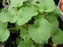 Трав'яниста рослина заввишки 60-150 см, діаметр надземної частини може сягати 30-90 см. У молодих рослин корінь стрижневий, у дорослих підземні органи представлені косим кореневищем з мичкуватими корінцями завдовжки 10-15 см. Окремі корені можуть сягати 30 см при товщині 0,6 см, при цьому вони розгалужуються. Бруньки відновлення розташовуються на кореневищі на глибині близько 2 см, а також біля основи цьогорічних пагонів.[3] Стебла монокарпічні (тобто після плодоношення відмирають), численні, прямостоячі, чотиригранні, залозисті. Листкові черешки у нижній частині стебла довгі, у верхній 0,5-2 см завдовжки. Листки серцеподібно-ланцетні, рідкозубчасті або городчасті, біля верхівки загострені, на нижньому боці повстисті, білувато-сірі, на верхньому вкриті численними ефірними залозками, завдовжки 7,5-10 см, завширшки 4-4,5 см. Їм притаманний сильний ганусовий аромат.