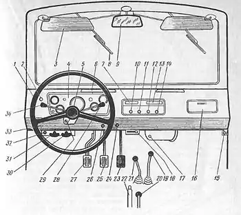 - Три плавких, з номінальним струмом 6А для захисту кола живлення контрольно-вимірювальних приладів, ліхтаря, вимикача заднього ходу і реле-переривника вмикача поворотів. Запобіжники встановлені під панеллю приладів.