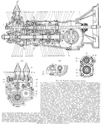 Редуктор заднього моста автомобіля має головну передачу із конічними спіральними шестернями. Для збільшення прохідності автомобіля у конструкції редуктора передбачене блокування диференціала. Головна передача розміщена у картері. Для підвищення жорсткості на зовнішніх поверхнях картера і його кришки є звивини. Картер і кришка з'єднуються шпильками і затяжними гайками. Прокладка між картером і кришкою не ставиться, а при кінцевій збірці ущільнення отвору проводиться за допомогою спеціальної пасти. Шпильки служать для кріплення редуктора до кронштейна кузова автомобіля. Ведуча шестерня встановлена у гнізді картера редуктора на двох конічних підшипниках. Між внутрішніми обоймами підшипників встановлена розпірна втулка і набір регулювальних прокладок. Внутрішня обойма переднього підшипника і набір регулювальних прокладок підтискаються маслознімним кільцем і зубчастим фланцем, встановленим шліцах шестерні і затискаються гайкою. Зовнішня обойма переднього підшипника притискається кришкою.