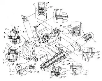 У вилках важелів (43) передньої підвіски на шворнях (2) встановлені поворотні кулаки (10), до яких кріпляться колісні редуктори разом із гальмівними механізмами. На задній осі колісні редуктори кріпляться до важелів підвіски. Вісь підвіски зварної конструкції, складається із двох сталевих труб, шліцевої втулки і двох кронштейнів, за допомогою яких підвіска кріпиться до рами кузова болтами (36). На осі встановлені важелі із запресованими у них металокерамічними втулками (42) і (52). Розміщення важеля і торсіона на осі фіксується болтами (51) і (32). При поломці торсіона, яка може виникнути у русі, важіль від сходу з осі утримується шайбою (40), що кріпиться до рами болтом до лонжерона рами. Хід колеса вверх обмежується гумовим буфером (18), а вниз обмежувачем (17). Втулки (52) і (42) важеля змащуються мастилом, що подається у маточину важеля через маслінку (45). Поверхня маточини важеля і осі підвіски герметизується гумовим кільцем (39) і прокладкою (46). У вилки важеля передньої підвіски запресовані шворні (2), зажаті через кулак (10) накладками (3). Шворінь від повороту у вилці запресований штифтом (13). Змащувальний матеріал до поверхонь тертя надходить від мастильниці (1) каналами у шворні. Для герметизації з'єднання встановленні манжети 8 і заглушка (7).