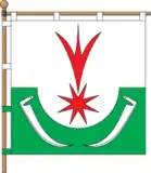 Квадратне полотнище поділене горизонтально на дві рівновеликі смуги – білу і зелену, вирубану дугоподібно. На верхній смузі червона восьмипроменева комета з хвостом, направленим вгору, у нижній дві білих коси, покладені діагонально, вістрями донизу.