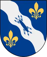 Сюжет герба: у синьому полі срібний хвилястий перев’яз ліворуч, на якому синій пучок стріл, обабіч перев'язу — по золотій лілії.