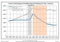 Динаміка населення з 1875 року в сучасних кордонах (Синя лінія: населення; Пунктир: відносна порівняльна динаміка населення землі Бранденбург; Сірий фон: період Третього рейху; Помаранчевий фон: період НДР)