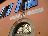 Оригінальний текст (італ.) ALOISIO GALVANO medico chirurgo doctori anatomes et artis obstericiae quod invento nobilissimo de suo nomine appellato physicam auxerit doctrinam eximiam pietale singulari cumulaverit sodales et amici viro per orbem clarissimo |