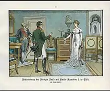 Зустріч з Наполеоном відбулася в Тільзіті 6 липня 1807 в будинку радника юстиції Ернста Людвіга Зіра, де Наполеон проживав під час переговорів.[7] Луїза була одягнена в прикрашену срібною ниткою сукню з крепу і незважаючи на боязку напруженість виглядала за свідченням очевидців прекраснішою, ніж будь-коли. Головний міністр Карл Август фон Гарденберг докладно підготував Луїзу до бесіди. Він порадив їй бути люб'язною, говорити насамперед від імені дружини і матері й у жодному разі не вести підкреслено політичних розмов. Королеву очікував сюрприз. Замість вселяючого страх чудовиська на зустрічі з нею з'явився вражаючий, очевидно, високоінтелектуальний чоловік, приємний у розмові. Луїза просила про стриманий підхід на мирних переговорах, Наполеон давав невизначені відповіді, але зробив комплімент її гардеробу. Коли він запитав, як же Пруссія могла проявити таку необережність і напасти на нього, Луїза дала часто цитовану відповідь: "Слава Фрідріха Великого ввела нас в оману з приводу наших коштів ".[8] Пізніше вона позитивно оцінила свої особисті враження від цієї розмови. І оскільки і імператор опинився під враженням, час взаємних образ закінчився, за винятком зауваження Наполеона, зробленого ним пізніше про те, що йому здавалося, ніби він слухав «папугу Гарденберга». До цього Наполеон неодноразово надзвичайно зневажливо відгукувався про Луїзу: вона нібито несе провину за початок війни, вона «жінка з чарівними рисами, але слабка духом … Її, мабуть, мучать страшні докори сумління за ті страждання, які вона завдала своїй країні».[9] Окупувавши Берлін, Наполеон віддав розпорядження опублікувати частину виявленого приватного листування Луїзи, в свою чергу Луїза ніколи не приховувала своєї глибокої відрази до Наполеона і своєї переконаності в його аморальності.