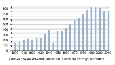 Схожа ситуація спостерігається з кінця XX століття. Історично, Львів був заснований як місто з переважальним руським населенням, проте вже в середині XIII століття, після перенесення до Львова столиці Галицько-Волинського князівства, у місті почали з'являтися національні меншини, зокрема, вірменська і німецька. Після приєднання Львова до Польського королівства, більшість населення становили поляки і німці, які згодом асимілювалися. У цей час сформувалися вірменський і єврейський квартали, які мали часткове самоврядування. За австрійського панування така етнічна ситуація збереглася. У міжвоєнний період XX століття більшість населення становили поляки, близько третини — євреї, близько десятини — українці. Внаслідок Голокосту та операції «Вісла» у Львові практично не залишилося євреїв і поляків, натомість, із приходом радянської влади, зросла частка росіян, які становили прислану адміністрацію. З індустріалізацією, міське населення поповнилося українцями, урбанізованими з мешканців області.