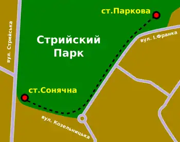 - Станції: «Паркова», «Сонячна» (до 1991 року — «Комсомольська» та «Піонерська» відповідно);