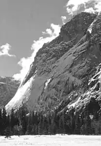 Льодовикова точка, як її видно з долини Йосеміті. Навесні обличчя кручі вкрите десятками струмків і маленьких водоспадів.