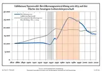 Динаміка населення з 1875 року в сучасних кордонах (Синя лінія: населення; Пунктир: відносна порівняльна динаміка населення землі Бранденбург; Сірий фон: період Третього рейху; Помаранчевий фон: період НДР)