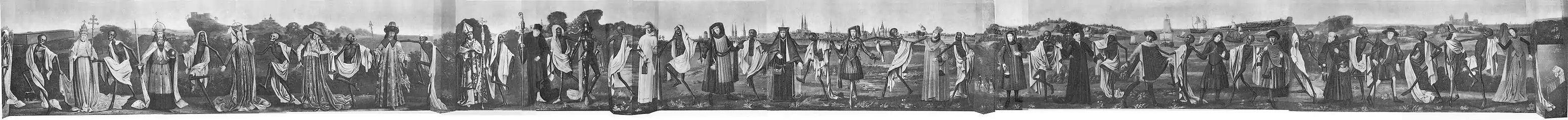 На відміну від більшості подібних творів, «Любецький танець смерті» був написаний не на стіні церкви, а на полотні. Фриз тягнувся по приміщенню безперервною смугою близько 30 метрів завдовжки і 2 метрів заввишки, який зображував (у повну величину) ланцюжок з дванадцяти пар містян на тлі Любека, яких веде Смерть. Кожен персонаж символізував зайняте ним місце у соціальній ієрархії: серед зображених були Папа Римський, імператор та імператриця, кардинал, король, єпископ, герцог, лицар, лихвар, ремісник, лікар, купець, чернець, селянин та інші. Зображення супроводжувалися віршованими рядками середньонижньонімецькою мовою, в яких герої «описували» свою смерть. Ймовірно, що приводом для замовлення фризу став спалах чуми, що стався у місті в середині століття.