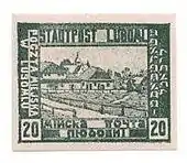 20. Сірого кольору, із зображенням католицького костелу Святої Трійці в фронті будинку Шмусля (Манишес Гінзбург Якова і Давида Корнфрахта).