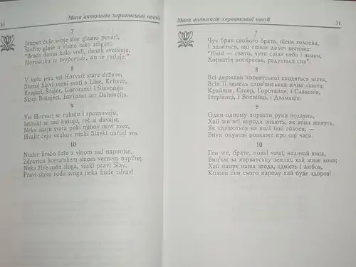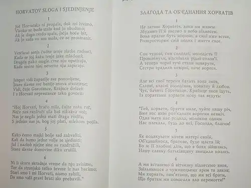 «Злагода та об'єднання хорватів» Людевита Гая в оригіналі хорватською і в перекладі українською Дмитра Павличка, ч.1 (ліворуч) і ч.2 (праворуч), джерело: Ідея світу. Мала антологія хорватської поезії. У перекладах Дмитра Павличка., К.: «Основи», 2008. — С. 28—31 | ||