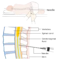 Пацієнт при люмбальній пункції має перебувати в положенні лежачи на боці (зрідка, сидячи), спину слід вигнути дугою, щоб остисті відростки хребців максимально розійшлися. Пацієнт має лежати на твердій поверхні (жорстка кушетка). Якщо хворий не здатен виконати інструкції через відсутність свідомості, його слід фіксувати у відповідному положенні. Проводять прокол спеціальною голкою, всередині якої знаходиться рухливий мандрен, як правило, між остистими відростками поперекових хребців LIII і LIV, рідше — або LII і LIII, LI і LII. Проміжок між LIII і LIV можна легко знайти — потрібно провести уявну лінію перпендикулярно хребту через верхні краї клубових кісток. Місце її перетину з хребтом покаже точку між остистими відростками LIII і LIV, куди і слід робити в подальшому прокол.