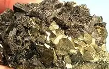 Знаходиться у тісному проростанні з піритом, бляклими рудами, халькопіритом.