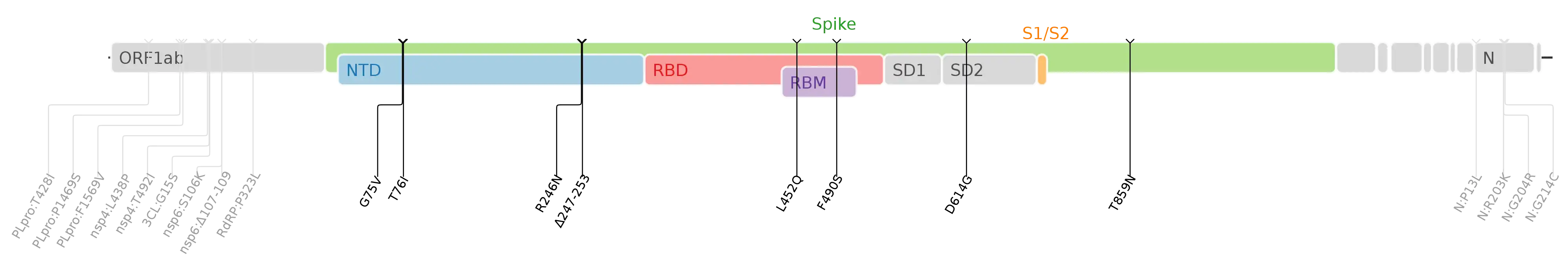 У геномі лямбди-варіанту є такі амінокислотні мутації, всі вони містяться в коді білка спайка : G75V, T76I, Δ246-252, L452Q, F490S, D614G і T859N.[10]
