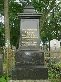 ![]() Надгробок на могилі полковника М. Г. Ляшенка. Петропавлівське кладовище, Чернігів. | |