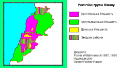 Соціальна структура. Найважливіша відмінна риса ліванського суспільства полягає в існуванні безлічі різних релігійних громад. Найбільшою християнською конфесією, яка охоплює близько чверті населення країни, є мароніти. До 17 ст. до маронітів відносилися в основному селяни, що проживали в північній частині Гірського Лівану, де колись керівною ланкою була династія Шехаб. Протягом подальших століть представники цієї релігійної громади розселилися по інших районах. Другу за чисельністю позицію в християнському середовищі займають православні, які зосереджені в першу чергу в містах, а також у ряді сільських районів, наприклад в Ель-Кура. Ще одну велику християнську громаду представляють греко-католики, що проживають перш за все в містах, особливо в Захлі (у долині Бекаа). Дві мусульманські громади, суніти й шиїти, разом складають понад 50 % населення країни. Суніти в більшості своїй містяни: вони широко представлені в таких міських центрах, як Бейрут, Триполі та Сайда. Шиїти, навпаки, віддають перевагу сільському способу життя і складають більшість на півночі долини Бекаа і в південному Лівані. Друзи, як і шиїти, переважно сільські жителі; вони зосереджені головним чином у південній частині Гірського Лівану і в передгір'ях гірської системи Антиліван.