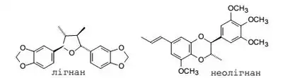 Утворення лігнанів. 1. Фенілаланінова похідна корицевого спирту (монолігнол); 2. Дибензилбутан; 3. Неолігнан
