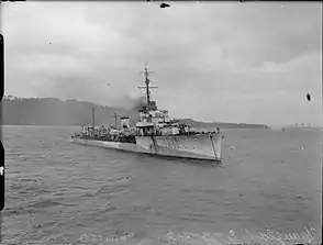 | Британський лідер ескадрених міноносців «Дуглас» на якірній стоянці в Плімуті. | ||