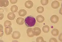 Підфарбований лімфоцит, оточений еритроцитами, оптичний мікроскоп