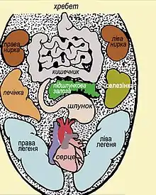 - Між лівою легенею і лівою ниркою — розташована селезінка.[4]