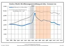 Динаміка населення з 1875 року в сучасних кордонах (Синя лінія: населення; Пунктир: відносна порівняльна динаміка населення землі Бранденбург; Сірий фон: період Третього рейху; Помаранчевий фон: період НДР)