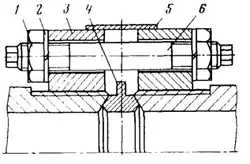 Рисунок 1. — Лінзове з'єднання: 1 — гайка; 2 — шайба; 3 — фланець; 4 — лінза; 5 — кожух; 6 — шпилька