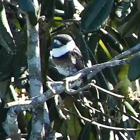 Він вимірює від 17 до 20 см. Оперення спини і крил чорне. Верх голови і дзьоб чорні, решта голови і шия білі. Груди коричневі, від шиї відокремлені чорною смугою. Живіт рябий, чорно-білий.