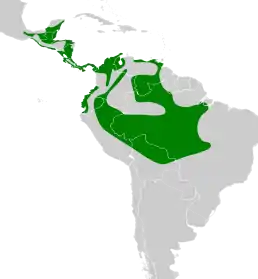 Вид поширений у Південній та Центральній Америці. Природним середовищем існування є субтропічні та тропічні вологі низинні ліси.
