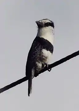 Птах завдовжки 25-26 см. Верх голови та широка лоральна смуга чорні; лоб, горло, потилиця і шия білі; грудний пояс чорний; живіт білий з чорними флангами; крила, хвіст і верхня частина чорні, з білими лусочками. Дзьоб масивний, чорного кольору. Райдужка темно-коричнева. Ноги чорнуваті.