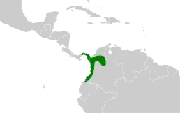 Вид поширений на півночі і заході Колумбії, сході Панами та північному заході Еквадору. Його природними середовищами існування є вологі низинні тропічні ліси від рівня моря до 1000 м.