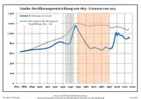 Динаміка населення з 1875 року в сучасних кордонах (Синя лінія: населення; Пунктир: відносна порівняльна динаміка населення землі Бранденбург; Сірий фон: період Третього рейху; Помаранчевий фон: період НДР)