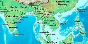 У 605 році зазнало навали армії імперії Суй (перед тим 602 року китайцями було підкорено північного сусіда Вансуан). Суйські війська захопили і розграбувала столицю Ліньї — Сімхапуру. У 620 році визнало себе васалом імперії Тан, куди неодноразово вирушали посольства з даниною.